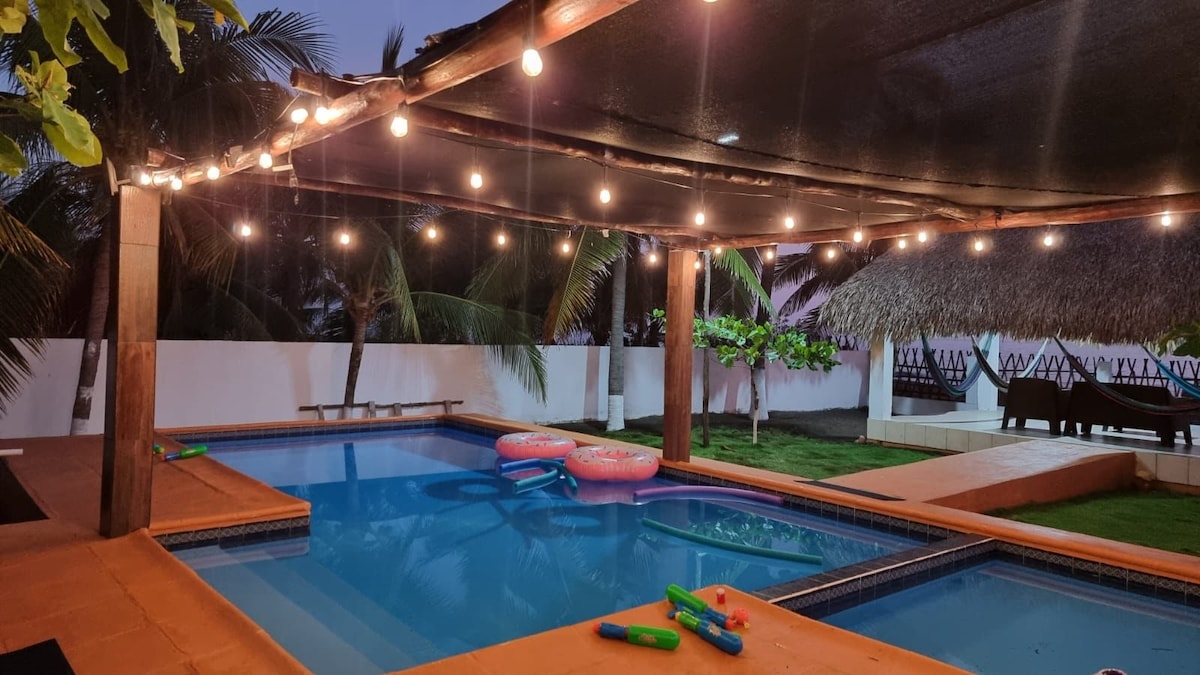 Casa de Playa frente al Mar, completamente privada. La casa cuenta con agua dulce se hizo cisterna para el efecto, y la piscina es de agua salada. Cocina completamente equipada con A/C. Dos habitaciones con A/C y baño privado cada una. Rancho de descanso con hamacas, salida peatonal a la playa, ideal para descansar, acompañado de amigos y familiares, Tranquilo y acogedor. Pensado para la privacidad de nuestros huéspedes. 3 parqueos privados adentro de la propiedad.