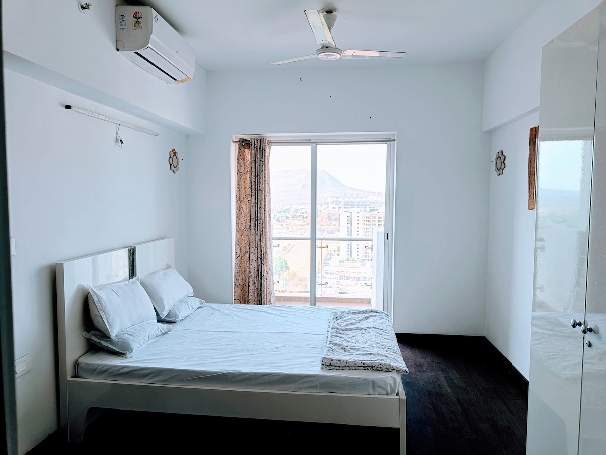 Fost Lodha Belmondo Golf Resort, noffru l-WiFi tagħna attivat, mgħammar sew, nadif ħafna u ċatt ta' 450 pied kwadru. Il-gallarija tagħna toffri veduti mill-isbaħ. Il-post apposta tagħna joffri l-kumditajiet moderni kollha (kċina mgħammra sew, Smart TV, 2 ACs u magna tal-ħasil). Korsa tal-golf b' 9 toqob u par-27 tinsab fil-kumpless Lodha Belmondo Golf Resort. Huwa aċċessibbli fuq bażi li tista' tiġi ċċarġjata. Dawk li ma jagħmlux parti mill-golf jistgħu jgawdu l-mixi bla ħlas madwar il-korsa u l-mixja qrib ix-xmara Pawana.