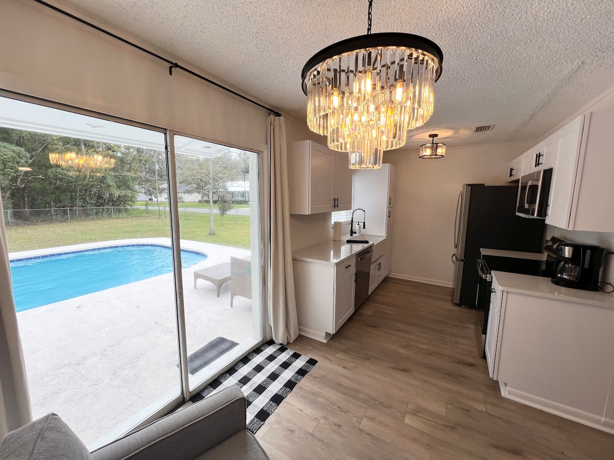ŻJARAT FIT-TUL MILQUGĦA....IRRILASSA fuq il-Kapitali tad-Dinja tax-Xmara St.Johns! Ħu rikba fuq dgħajsa lejn l-Isprings! Sajd, Shrimping, Kayaking, jew għawm. Kumditajiet: Stainless Steel Grill, Fire Pit, porch swing, dock tad-dgħajsa, gverta w/2 imwejjed tal-pikniks. KAYAK 'S offrut: għal 3 Persuni . Kċina u tisjir kompluti, magna expresso Kmamar tal-banju w/walk in doċċa Sid is-Suite għandha Banju Spa li jixxarrab għal 2. Pets aċċettati: ir-regoli jintbagħtu wara l-booking tiegħek. It-tariffa għall-pets hija ta '$ 75 għal kull annimal domestiku għaż-żjara MHUX għal kull lejl.