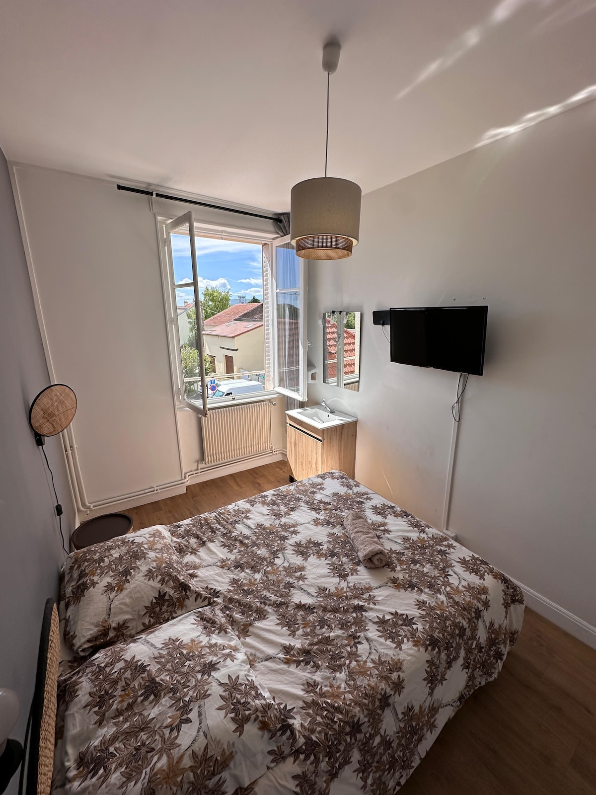 28M2 - 2 People. With its mezzanine space, this elegant cocoon will enhance your nights in Clermont-Ferrand. Its staircase leading to a refined night space gives it a unique allure. All our Duplex rooms can be converted into twin beds, and some have a terrace. Please specify your preferences when booking.