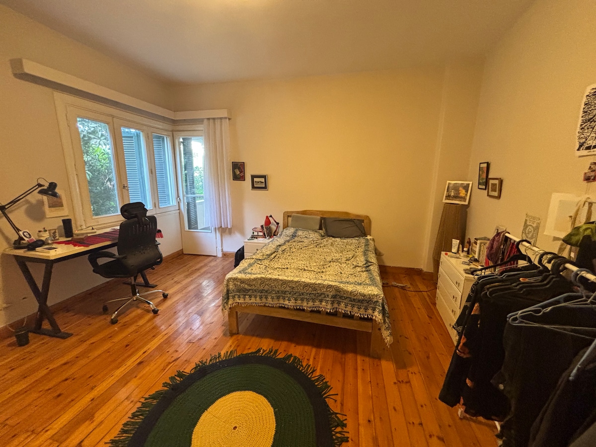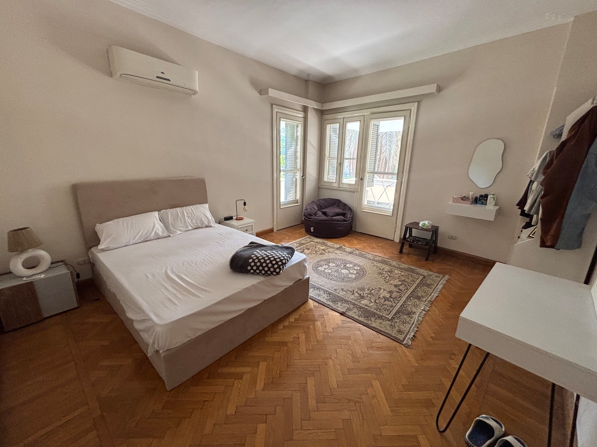 Stay in a bright private room inside a shared, fully renovated apartment in Garden City—Cairo’s most elegant, tree-lined district—just behind the Four Seasons Nile Plaza. The home’s star feature is the large balcony with rare green views over two landscaped gardens plus a peek of the Nile Corniche only a 1–2 minute walk away—perfect for morning coffee or an evening wind-down. Your room is calm and comfortable, with A/C, fast Wi-Fi, a work desk, wardrobe, blackout curtains and green view.