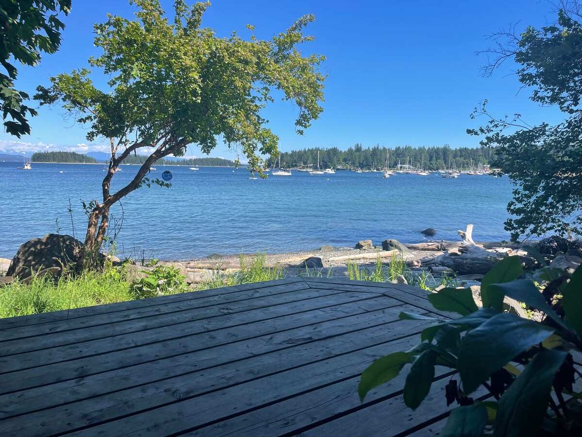 Din il-cottage mibnija bl-idejn għandha twieqi kbar u terrazzin li jħares lejn il-Lag tal-Aja u x-xenarji tal-blat ta 'Turtle Island. Intefa 'f' arbuxell żgħir ta 'siġar Cedar u Firma, iżda fil-qalba ta' Mansons Landing bi ħwienet u kafetterija tal-furnara ftit passi 'l bogħod. Huwa għaxar minuti mixi lejn l-għawm, paddle boarding u kayaking f 'Sandy Beach adattat għat-tfal, jew mixja ta' 15-il minuta' l isfel lejn bajja tal-oċean u Laguna ta' Mansons. Is-Suq tal-Ġimgħa u l-Mużew ta 'Cortes jinsabu ftit' il bogħod.