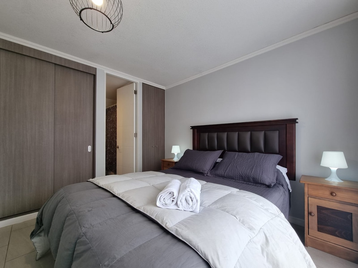 Moderno departamento, 1 habitación cama de 2 plazas y sofá cama de 1,5, baño completo, cocina equipada, terraza y aire acondicionado. Capacidad para 3 huéspedes, wifi incluido. A pasos del Metro Santa Ana. Disfruta piscina, gimnasio, sala de reuniones y lavandería. Cerca de parques, museos, restaurantes y vida nocturna en Barrio Lastarria, Patio Bellavista y Barrio Italia. ¡Vive Santiago con estilo. Disfruta de la capital desde el corazón de la Capital.
