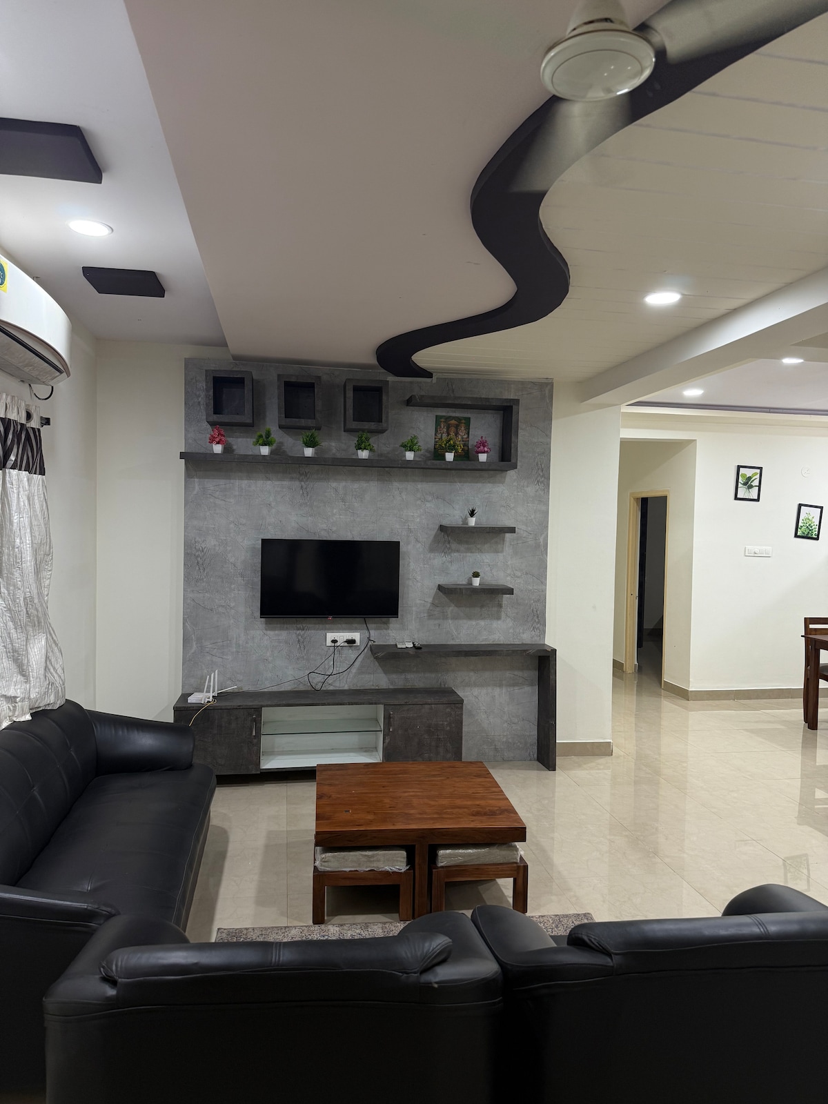 Welcome to our Stylish 3 BHK apartment, perfect for short or long stays. Enjoy 3 AC bedrooms with private baths, a cozy living room with a 43" Smart TV, high-speed WiFi, and an indoor swing. The kitchen is fully equipped with a gas stove, microwave, RO purifier, fridge, and utensils. Relax at the spacious dining table or read from our book collection. Located near Hitech City Metro, Rameshwaram Cafe (100m), US Visa Center (1km), Cable Bridge, IT hubs, For any questions you can dm @7382509306