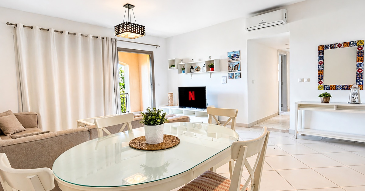 My home is a cozy, two-bedroom ,four beds . It’s just a two-minute walk from the marina, and it overlooks the serene lagoon. The rooms are spacious, bright, and perfect for a relaxing getaway. Guest access A payment of 2000 EGP per person this required to receive the QR codes and beach access