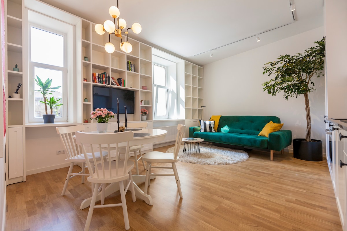 L-appartament tad-disinn tiegħi f' bini storiku rinnovat jinsab biss 5 minuti bil-mixi 'l bogħod mill-Belt il-Qadima ta' Riga. Is-salott u ż-żona tal-ikel flimkien jiġu b 'ħafna dawl naturali. Erġa 'lura fuq is-sufan komdu u gawdi ktieb jew xi TV jekk dan huwa dak li tippreferi. Il-kċina mgħammra bl-għodod tat-tisjir kollha meħtieġa u magna tal-espresso biex tkun tista' tibda filgħodu kif suppost. Is-sodda b' daqs ta' Queen komda fil-kamra tas-sodda se tiggarantixxi li l-ħin tiegħek hawnhekk ikun rilassanti!