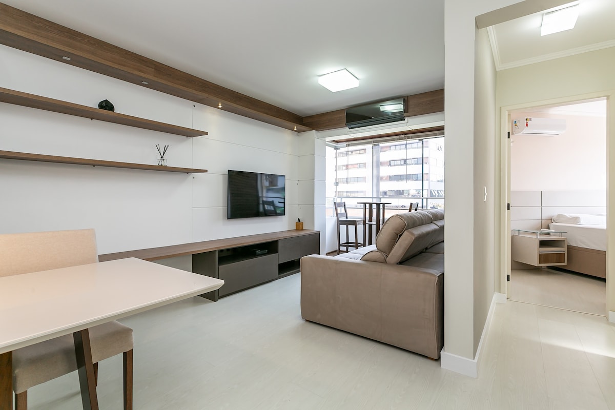 Appartament modern u rinnovat kompletament fuq sular għoli, 02 sodod: King-size u koppja komda ħafna, Smart TV 50”, skrivanija, WIFI, arja kkundizzjonata, tazza, akkoljenza 24 siegħa kuljum, POOL IMSEĦĦNA, gym u parkeġġ b'xejn. Post strateġiku ġewwa Bairro Itacorubi, wieħed miż-żoni ċentrali u l-aktar konnessi ta' Florianópolis, qrib ċentri kummerċjali, universitajiet, ristoranti, bars, spiżeriji u bajjiet