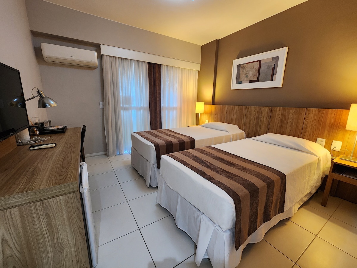 O apartamento é claro, arejado e cuidadosamente preparado para oferecer conforto. Dispõe de duas camas de solteiro que podem ser unidas, formando uma cama de casal, além de TV a cabo, ar-condicionado, armários e cozinha equipada com frigobar, micro-ondas, cafeteira, filtro de água, fogão de indução e sanduicheira. Ideal para quem viaja a lazer ou a trabalho. O condomínio oferece infraestrutura de excelência, com piscina, sauna, academia e restaurante.