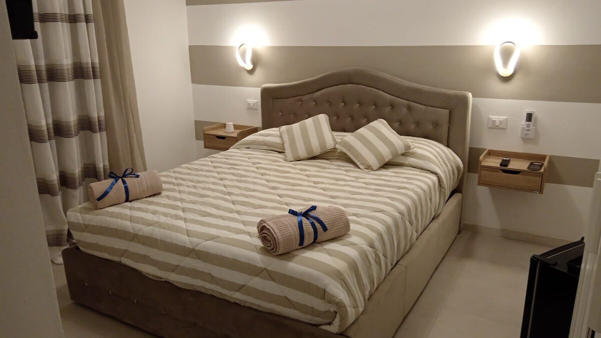 Camera doppia con letto a due piazze,bagno privato separato dalla camera da un antibagno La camera è fornita di armadio a muro con cassaforte interna e cassettiera fornita di specchio. Disponibile TV via cavo e canele Netflix (messo gentilmente a disposizione degli ospiti) fornisco set biancheria per bagno (doccia,mani e viso ,intimo) fornisco set detergenti ( mani,doccia,intimo) set per barba e pulizia orale coffe machine and mini fridge Non forniamo servizio colazione ,ascensore non presente