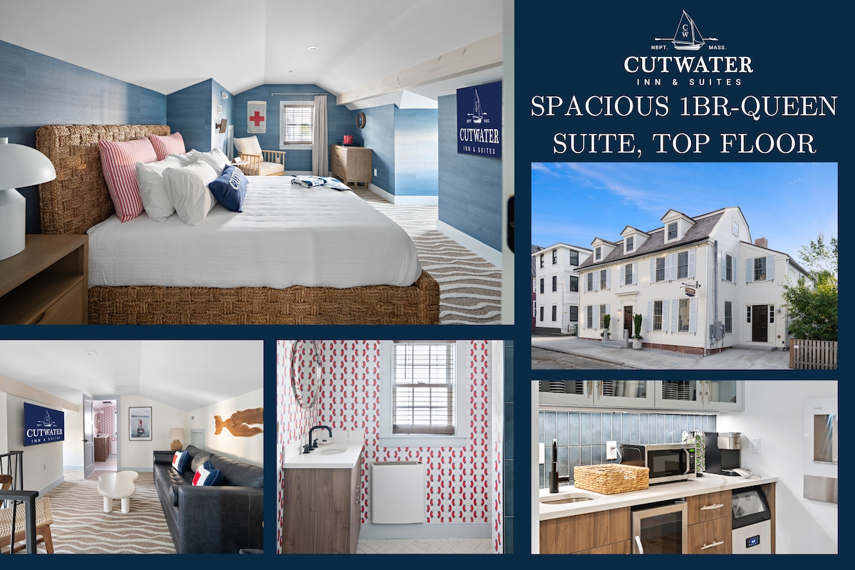 Your coastal getaway awaits! ⚓ The Grand Suite — a luxurious retreat at Cutwater Inn & Suites. This spacious 475 sq. ft. main-floor suite offers a king bed, queen sleeper sofa, and kitchenette. The only suite with a shower & tub, and a private outdoor patio. Comfort, style, and fresh sea air await! ☀ Steps to Newburyport’s shops & restaurants 🌊 5-min walk to the waterfront 🍷 Surrounded by local dining & boutiques 🚉 10-min drive to the Newburyport train station 🅿 Nearby public parking
