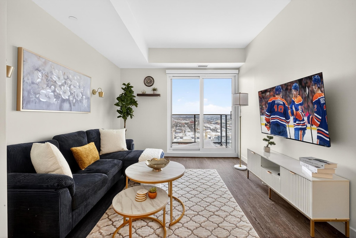 Kċina mgħammra b' kollox u għamara komda huma ideali għal żjarat itwal. Uża l-pixxina u l-gym biex iżżomm ir-rutina tal-eżerċizzju tiegħek waqt li tkun qed tivvjaġġa. Gawdi aċċess faċli għal kollox minn din id-dar li tinsab f' post perfett. Ħu veduti mill-isbaħ tal-belt mill-gallarija. Tinsab biss ftit passi 'l bogħod mill-aqwa ristoranti, kafetteriji u postijiet tad-divertiment tal-belt, mixi' l bogħod minn Rogers Place, l-Università ta' MacEwan u tranżitu ta' malajr lejn l-Università ta' Alberta.