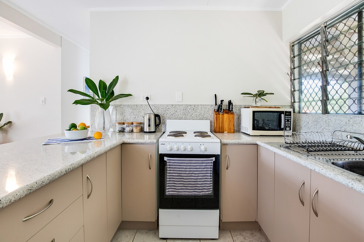 Stenna sakemm ix-xemx tifxek fuq il-pixxina u tisma' l-għasafar jkantaw f'dan l-appartament żgħir mimli dawl. Imtarra' qalb is-siġar tal-palm, l-ispazju jħossu mimli dawl, arja friska u privatezza komda - post tropikali fejn tistrieħ. Jinsab f'Railway Estate, post mimli siġar, u tinsab ftit passi 'l bogħod mill-Istadjum QCB u inqas minn 10 minuti bil-karozza 'l bogħod mill-belt u Strand. L-appartament sħiħ huwa tiegħek, b'aċċess privat, wifi, kċina mgħammra sew, żona tal-għajxien b'netflix, kamra tas-sodda queen u ensuite b'xaver tax-xita u magna tal-ħasil.