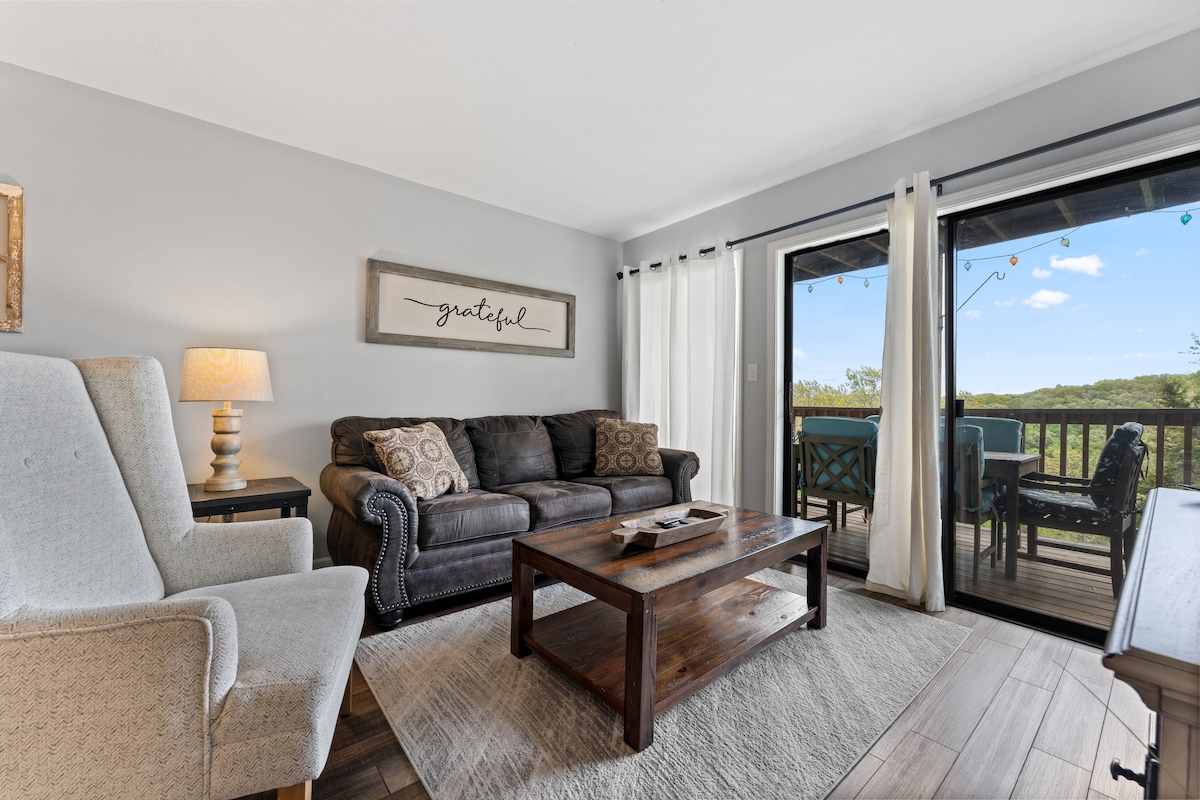 Din il-condo ta' Branson Vacation tinsab f' kumpless kwiet f' nofs iktar minn 300 ettaru ta' muntanji msaġġra ta' Ozark. Se tgawdi minn appartament li għandu dawl mill-aqwa u veduti sbieħ tal-Muntanji Ozark! Is-sodda queen tagħna għandha topper tal-fowm ta '4 pulzieri biex tagħtik il-kumdità żejda ta' lejl mill-aqwa ta' rqad' il bogħod mid-dar. Hemm sufan komdu ħafna (bi rqad ta' daqs queen) u TV kbir fis-salott biex tkun tista' tirrilassa wara jum divertenti fuq il-lag jew f' Branson.