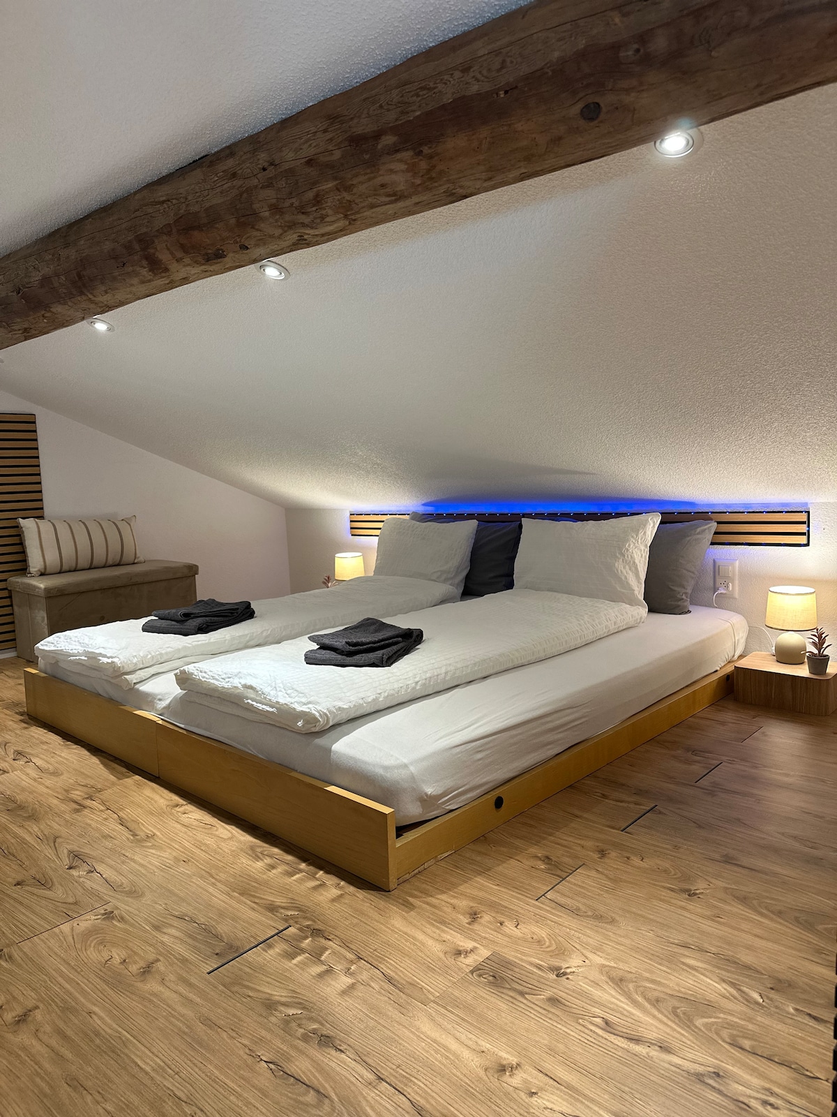 Studio ta' Penthouse b' terrazzin ta' 100m2, veduti bla waqfien tal-Alpi u hot tub PRIVAT. Spazju fuq ġewwa magħmul minn salott u kamra tal-ikel miftuħa b' sodda murphy li tintewa (180ċm), TV bi skrin kbir, kamra tal-banju sħiħa u uffiċċju komdu. Il-kċina għandha dak kollu li għandek bżonn. Fuq barra, it-terrazzin u l-veduti qed jistennewk. Mejda tal-ikel fuq barra, hammock u skutella tan-nar jistiednuk tirrilassa. Agħlaq l-aċċess għal Gemmi & Torrant cable cars u banjijiet termali.