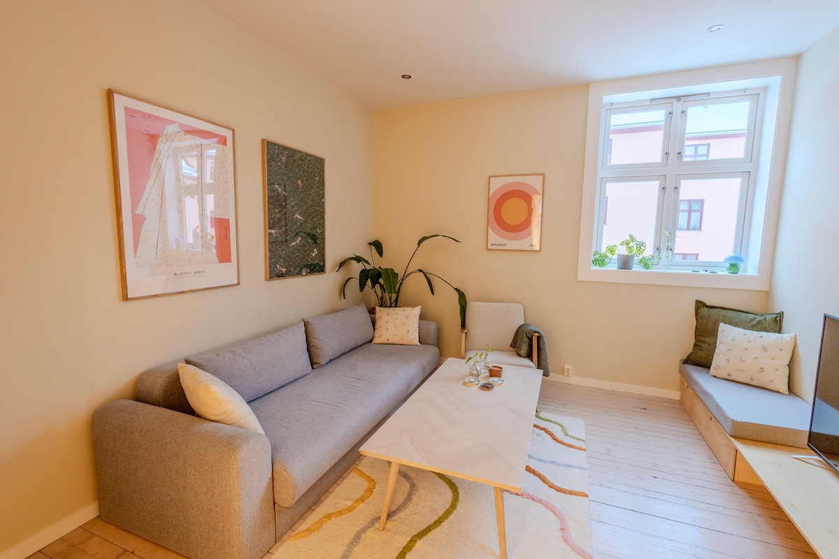 Appartament klassiku f 'disinn nordiku. Jiffaċċjaw ġnien kwiet w/fjuri u frott. Viċinat vibranti sabiħ. Salott spazjuż: TV w/chromecast, fireplace, mejda għall-ikla ta 'filgħaxija u għax-xogħol. Sufan. Kċina: Dishwasher, magna tal-ħasil, prodotti għat-tisjir u l-ħami, Moccamaster, l-istampa Franċiża, coffegrinder, kitla. Kamra tas-sodda numru 1: Sodda Doppja 160x200 Kamra tas-sodda numru 2: 2 sodod 90x200/ bunk għall-adulti Kamra tal-banju funzjonali żgħira. Għat-tarbija tiegħek: Siġġu għoli, kott tal-ivvjaġġar, kuxxinett li jinbidel, stroller.
