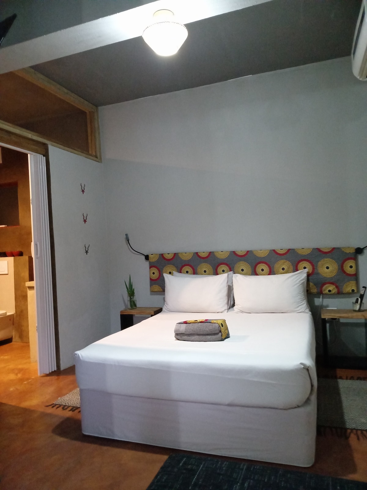 Very well equipped budget rustic self cater flat in a garden setting. An old house changed into separate units. 6 Steps to the only door. Lots of windows, light. Next to the swimming pool and a communal path and own bbq (braai) and garden furniture. Small bathroom through the kitchen ( basin toilet shower). Gas stove. Ceiling fans only. 1 Large bedroom. Lounge & dining. Appliances, furniture and decor vary ( new, old, handmade bought) items. NOT modern but simple & functional arty. No TV.