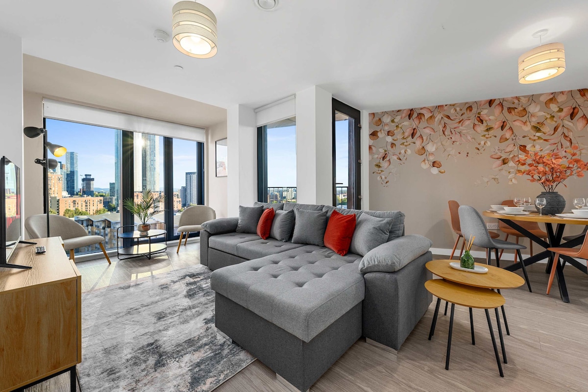 Skopri għajxien kontemporanju f' dan l-appartament spazjuż b' żewġ sodod, ideali għall-vjaġġaturi fuq xogħol, għall-koppji u għall-familji! Gawdi veduti qrib ix-xmara u terrazzin privat. Il-post fejn toqgħod miftuħ għandu kċina mgħammra b' kollox u dekor eleganti. Parkeġġ bla ħlas, żewġ sodod tal-plush, WiFi b' veloċità għolja, spazju apposta għax-xogħol u TV kbir ta' 80 pulzier! Dan l-appartament jinsab biss mumenti mill-aqwa ristoranti, kafetteriji u siti kulturali ta' Chapel Street, u joffri kumdità u konvenjenza għaż-żjara tiegħek ġewwa Manchester.