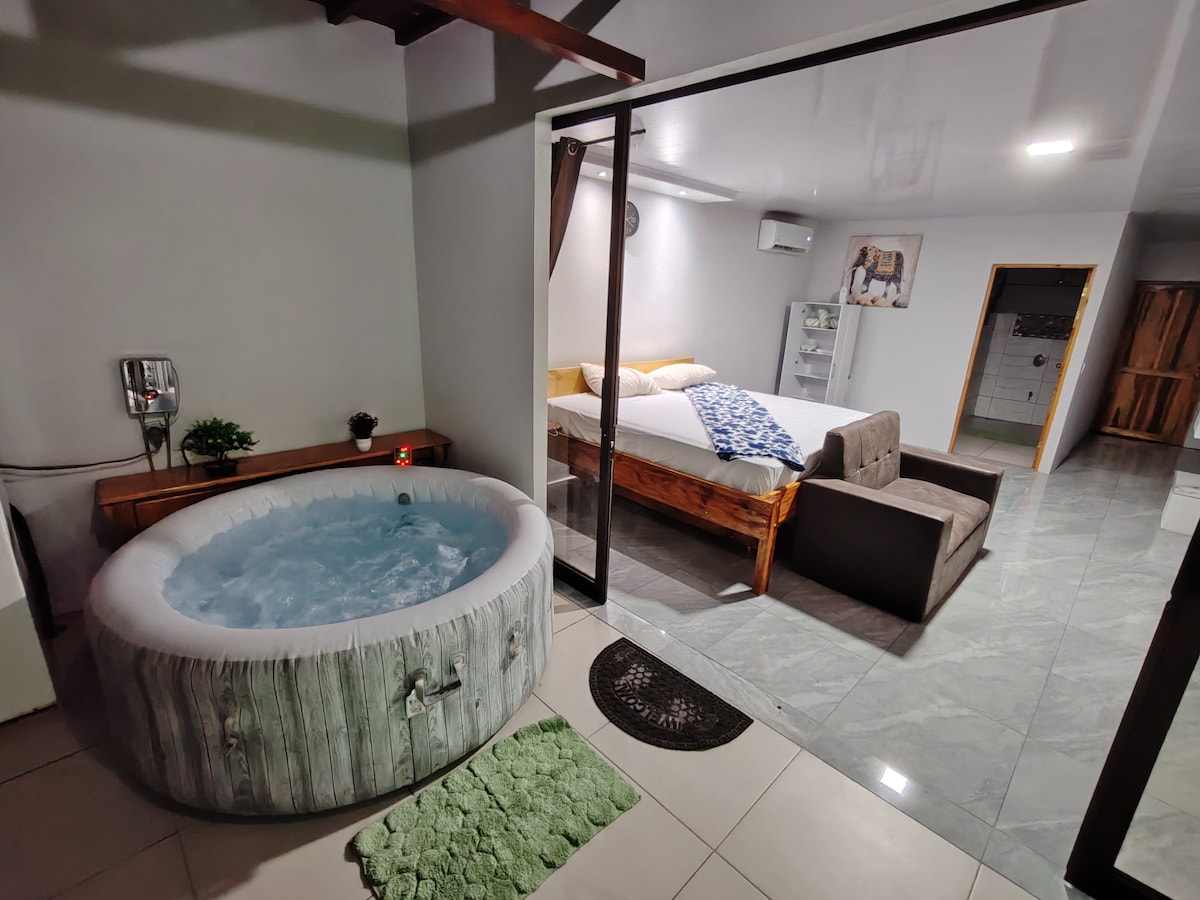 This beautiful studio is located just couple blocks away from La Fortuna downtown, which offers the versatility to explore the town and the touristic area without renting a car or parking and walking around This place is fully equipped, from fast wifi (+200mbps), comfortable King size bed, A/C, Smart TV, kitchenette, dehumidifier. A private front porch with table, chairs & JACUZZI, full private bathroom with hot water and hair dryer, safety box large enough for computer, closet and parking spot