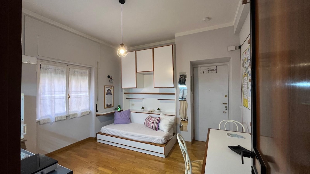 Appartament ta' studio komdu li jinsab fil-viċinat il-ġdid ta' Aurelio, ftit kilometri 'l bogħod mill-Belt tal-Vatikan u d-distrett ta' Prati. L-akkomodazzjoni tinsab fis-sular t' isfel ta' bini li għadu kif inbena u hija faċilment aċċessibbli, mgħammra bil-kumditajiet kollha u l-ispazju fuq barra. Fil-qrib tista' tilħaq l-Istazzjon Aurelia jew il-waqfa tax-xarabank biex tasal fiċ-ċentru ta' Ruma fi żmien 15-il minuta. Hemm ukoll il-possibbiltà li tipparkja bla ħlas fiż-żona.