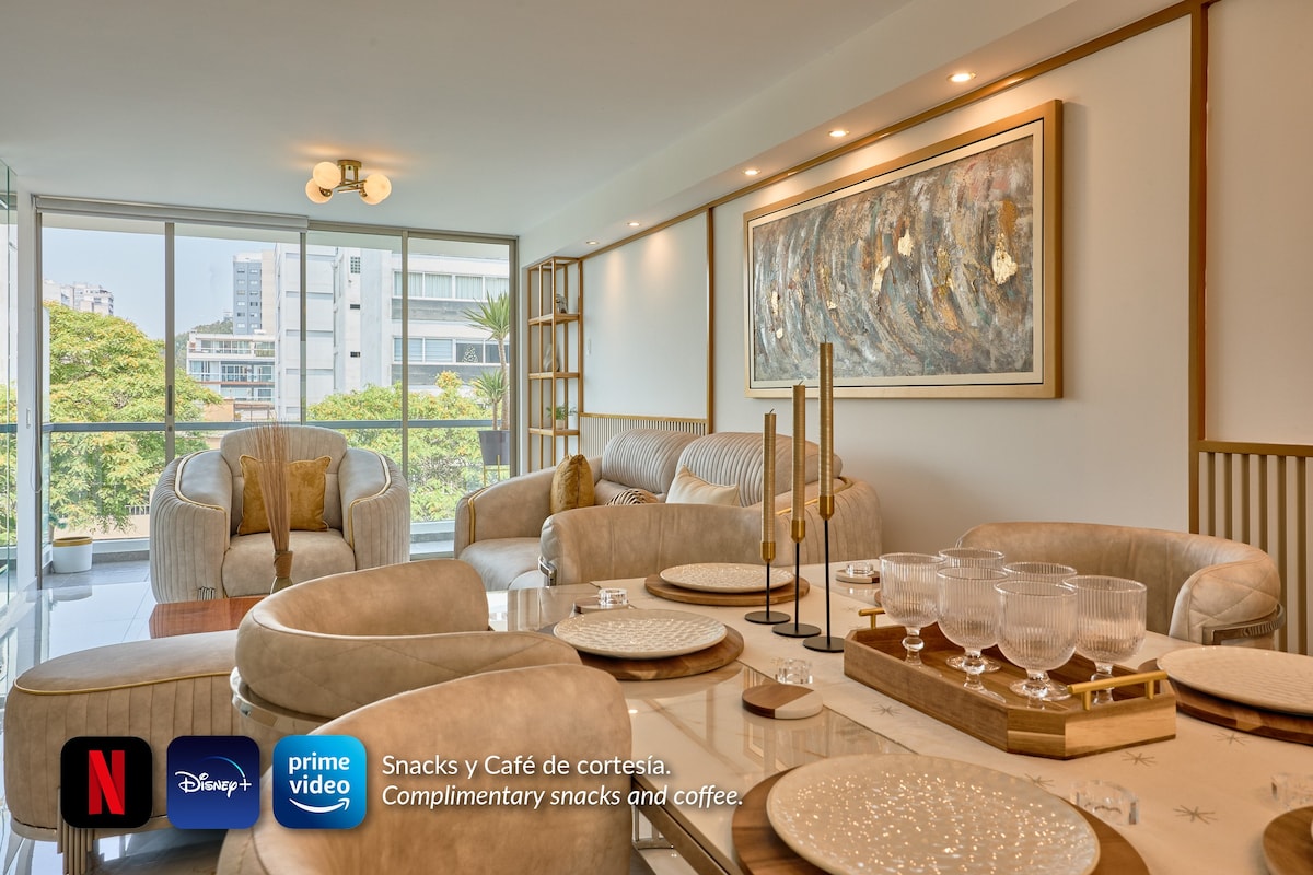 Appartament modern u komdu kompletament mgħammar fil-qalba ta' Miraflores (Av. José Pardo), turġien mill-Park ta' Kennedy, l-esplanade u l-Larcomar. Ideali għat-turiżmu jew għax-xogħol. Għandha 2 ikmamar tas-sodda: dik ewlenija b' sodda doppja queen u dik sekondarja b' sufan sodda b' żewġ sits flimkien ma' 1.5 postijiet oħra. Salott b' sufan b' daqs ta' queen u gallarija b' veduta fuq barra. Wifi b' veloċità għolja, kċina mgħammra, Smart TV, pixxina, gym u sorveljanza 24 siegħa kuljum.