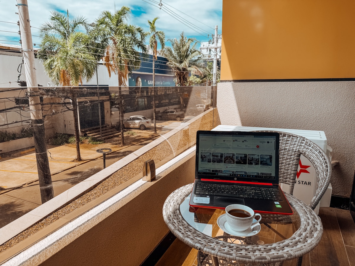 Bienvenidos a la zona más activa de Santa Cruz! El precio ya incluye todas las comisiones no pagarás nada adicional en la app. El apartamento es un monoambiente totalmente equipado, moderno y cómodo. Cuenta con una cama de 2 plazas y un sofá cama además del baño privado, lavadora/secadora, cocina y todos los electrodomésticos necesarios. Internet Wi-Fi, tv cable y NETFLIX. Cerca de supermercados, los mejores restaurantes de la ciudad y malls.