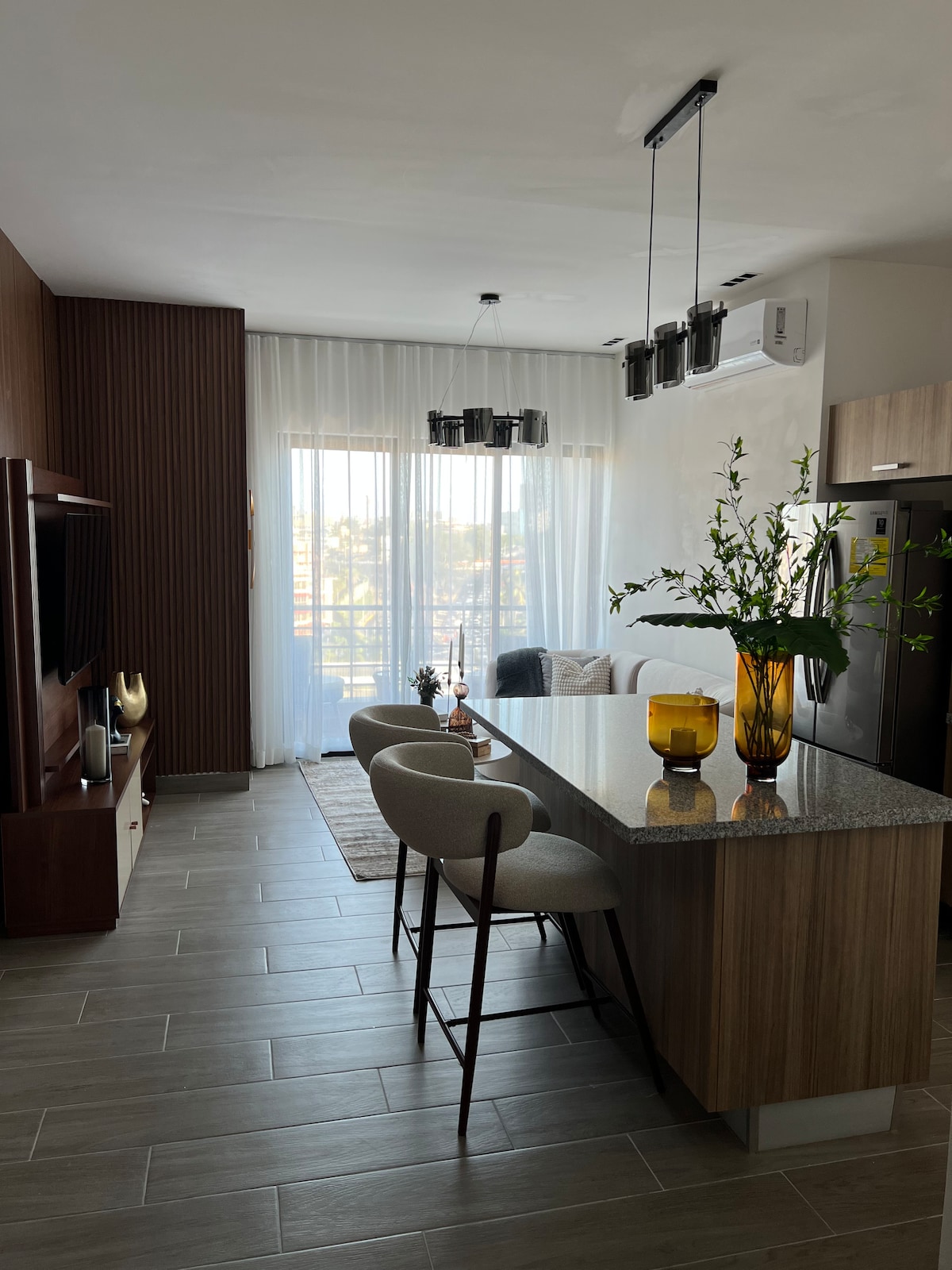 Beautiful apartment in a modern tower, it has 2 complete bedrooms each with its own bathroom, air conditioning and smart TV. The living room area has air conditioning and smart TV, one person can also sleep on the sofa bed. The apartment has a fully equipped kitchen and laundry area, on the top floor there is a social area that has a jacuzzi, bbq and gym. The place is a 5-minute walk from Plaza Duarte, where you will find shops, a supermarket, a cinema, a hair salon and a food court