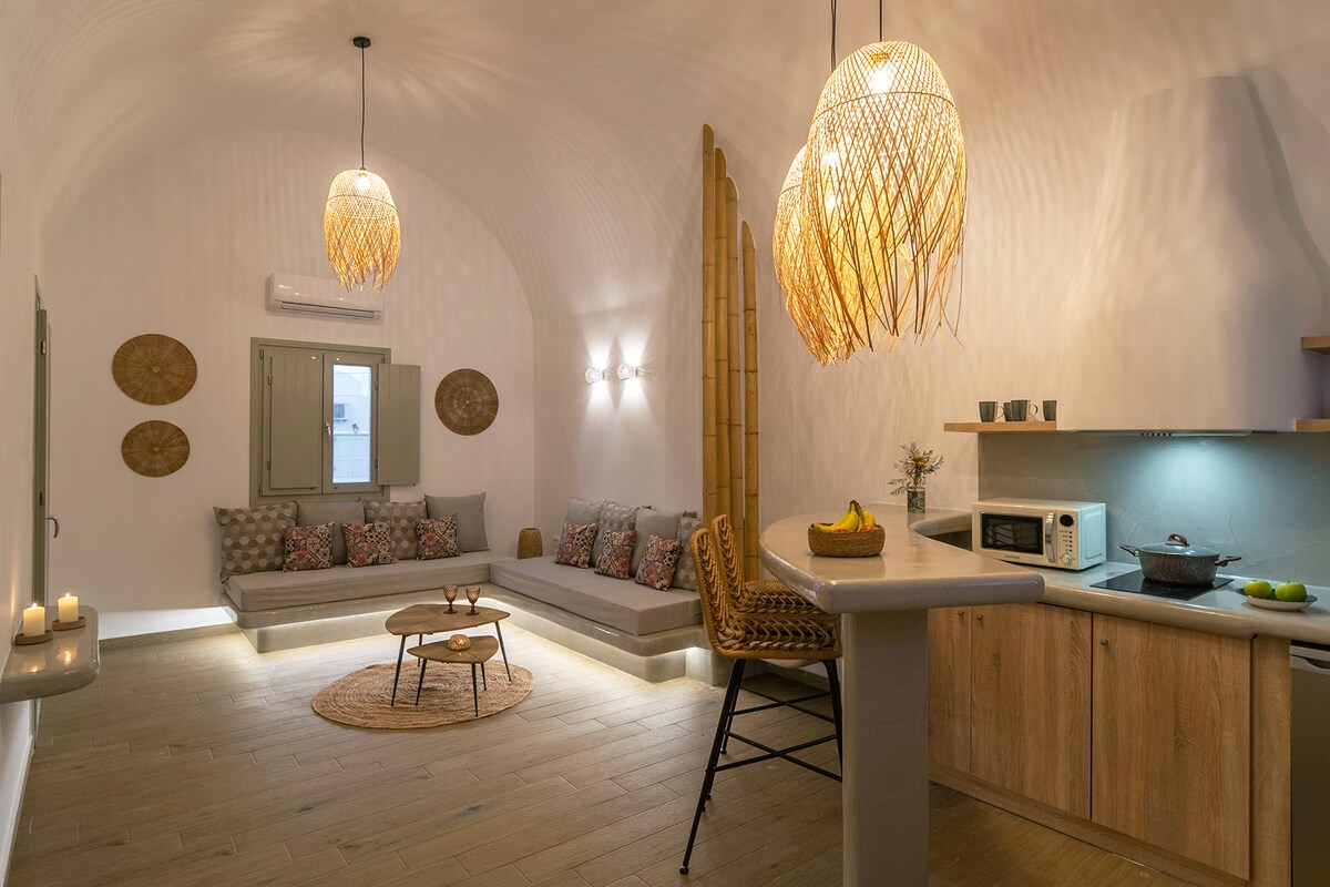 Bluedome suite is a renovated traditional cavehouse ideal for couples and small families. It has been built with the traditional Cycladic cavehouse architecture, carved in the Volcanic caldera rock. Its’ minimally designed spaces invite relaxation and comfort. The master bedroom (with en suite bathroom) is at the back of the cave connected to the living room and seating area, kitchen and second full bathroom, overlooking the patio and custom-built hot tub.
