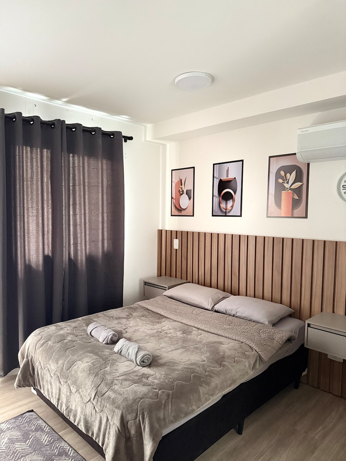 Studio recém reformado e decorado no Centro Cívico com: ar condicionado em todo o ambiente, cozinha completa, smart tv e churrasqueira privativa O prédio oferece piscina aquecida, academia, terraço panorâmico, sauna, brinquedoteca, jacuzzi e lavanderia (paga) Ideal para até 2 pessoas, fornecemos roupas de cama de tolhas de 1ª linha Localização excelente, perto de shoppings, mercados, restaurantes e padarias com fácil acesso para explorar a cidade Estacionamento pago no local disponível