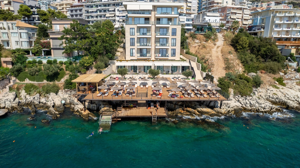 Gawdi veduta mill-isbaħ faċċata tal-bajja tal-baħar kollu f' Sarandë . B' aċċess dirett lejn il-baħar u wieħed mill-iktar postijiet sbieħ waqt li toqgħod f' wieħed mill-iktar postijiet mixtieqa ġewwa Sarandë, bil-kumditajiet kollha ppubblikati għall-kumdità tiegħek. Il-bajja tinfetaħ fil-bidu tal-istaġun lejn l-aħħar ta' Mejju. Il-klijenti għandhom aċċess bla ħlas għall-bajja u ż-żona tal-għawm, filwaqt li s-sodod tax-xemx huma disponibbli għal tariffa addizzjonali.
