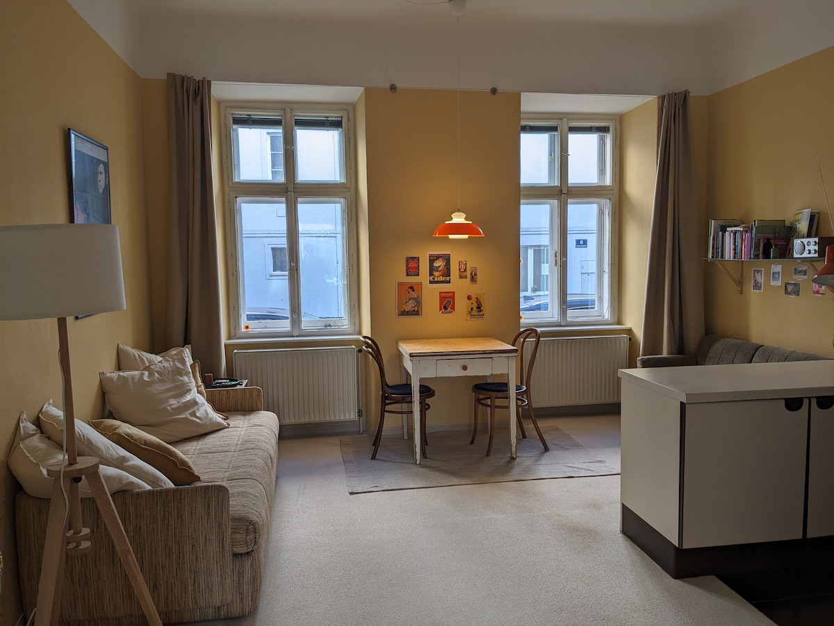 Merħba ġewwa ♡ Vjenna! Is-suite farfett li tinsab kwieta fit-12-il distrett ta 'Vjenna hija ddisinjata għal 1 sa 4 persuni - mhux biss għall-mużiċisti! Joffri salon spazjuż bil-pjanu, żona tal-ikel, kċina żgħira b 'sens ta' bar u Nespresso, librerija b' żona tax-xogħol, kamra tas-sodda romantika, WiFi u kamra tal-banju oriġinali tas-snin 70. Bit-trasport pubbliku - xarabank, trammijiet u metro - inti tinsab fiċ-ċentru, il-Kastell ta 'Schönbrunn jew fl-istazzjon ewlieni tal-ferrovija fl-ebda ħin. Gawdi!