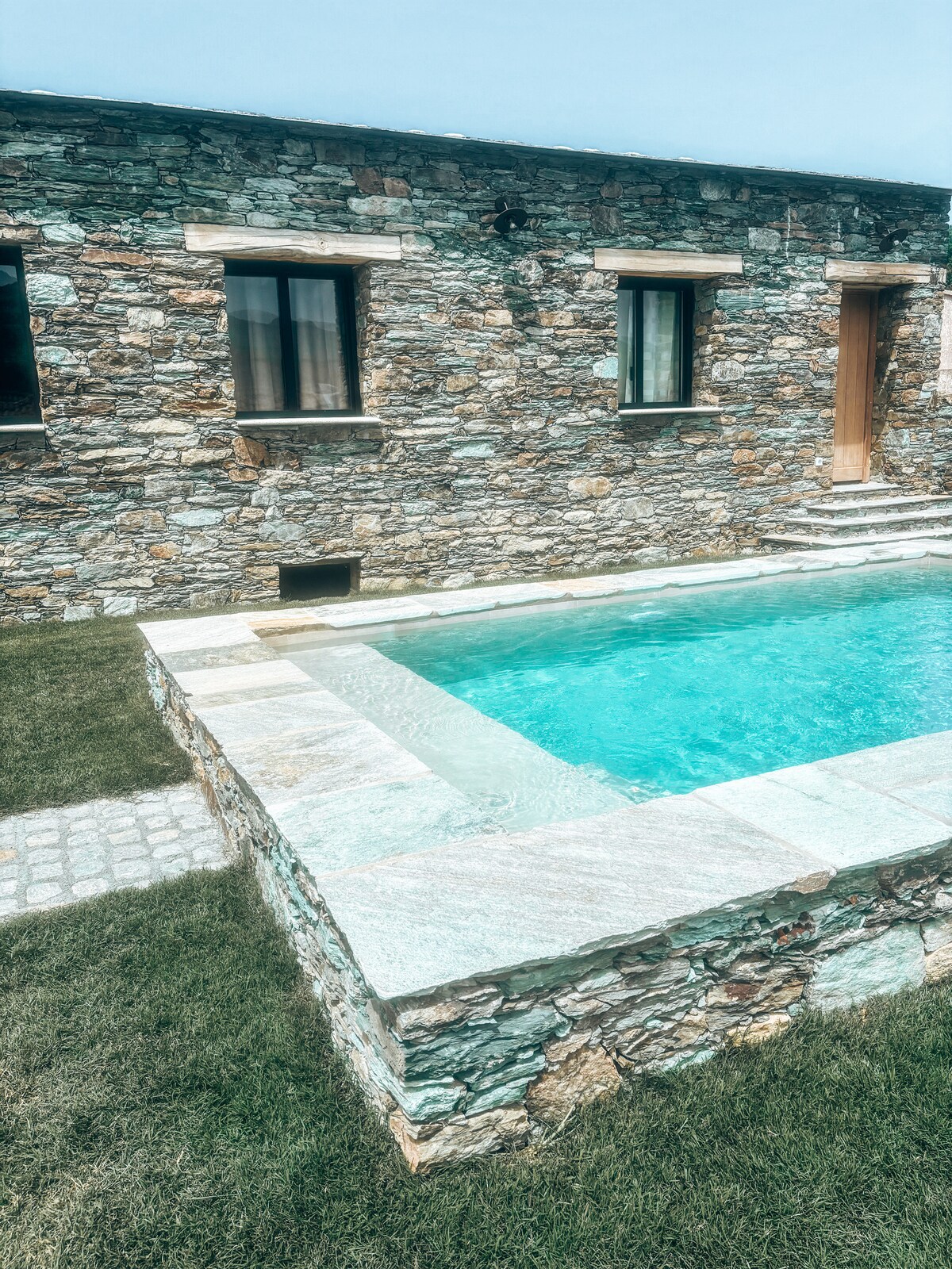 Residenza tal-ġebel bejn il-baħar, il-muntanji u l-pixxina.