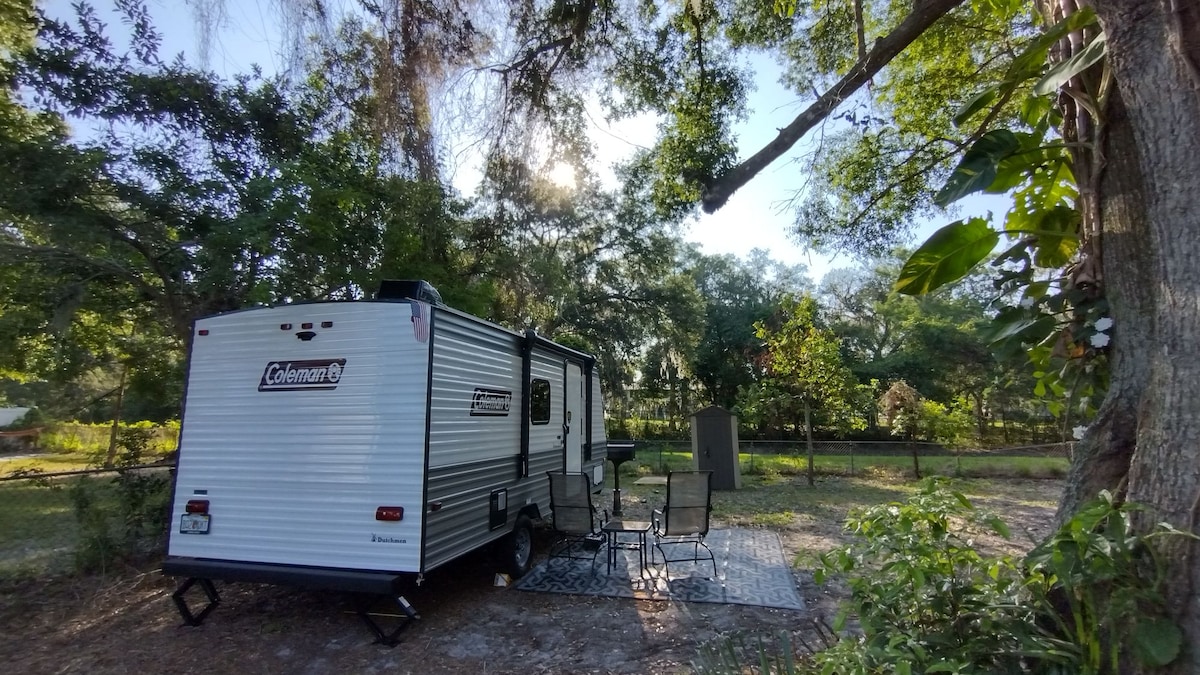 Dan ir-RV bl-arja kkundizzjonata ta 'daqs sħiħ, hemm kamra tas-sodda b' sodda doppja' king', kamra tal-banju b 'doċċa, sink u tojlit, kċina bil-friġġ, friża u stufi u salott. Nadif u komdu! Kumditajiet inklużi l-wi-fi, il-wiċċ ta' barra w/ siġġijiet. Skopri ż-żona! 40 minuta biss minn Disney, Universal u Sea World! Jekk jogħġbok żomm f' moħħok li l-RV u l-propjetà kollha huma mingħajr tipjip u mingħajr vape