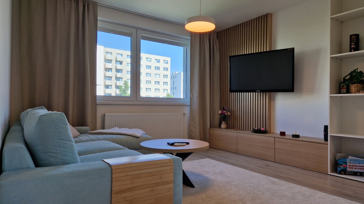 Appartament ta' disinjatur qrib l-ajruport b' terrazzin kbir bix-xemx. Dan joffri l-paċi, l-istil u l-aċċessibbiltà mill-aqwa għaċ-ċentru ta' Bratislava. Inkluż spazju għall-parkeġġ suburban. Il-viċinat għandu kumditajiet ċiviċi eċċellenti (Avion, IKEA, STARBUCKS, MC DONALDS...). L-appartament huwa mgħammar b' kollox - magna tal-ħasil, dryer, dishwasher, ċinema tad-dar bis-servizzi kollha ta' streaming u kċina mgħammra b' magna tal-kafè. Filgħaxija tista' tgawdi tazza inbid fuq it-terrazzin kbir b' veduti mill-isbaħ.