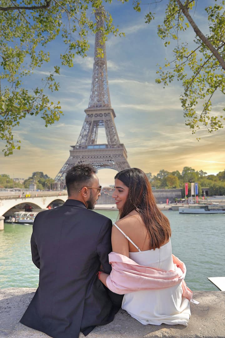 Sessjoni ta' teħid ta' ritratti professjonali romantika fit-Torri Eiffel u fix-xmara Seine.