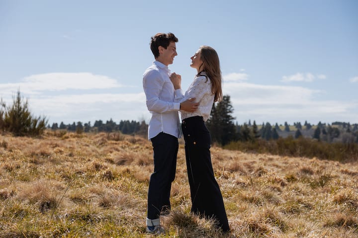 Sessjoni ta' ritratti fuq barra għal tnejn, fiċ-ċentru storiku, fil-park ta' Clermont-Ferrand jew fil-qalba tan-natura fil-firxa tal-muntanji ta' Puys.