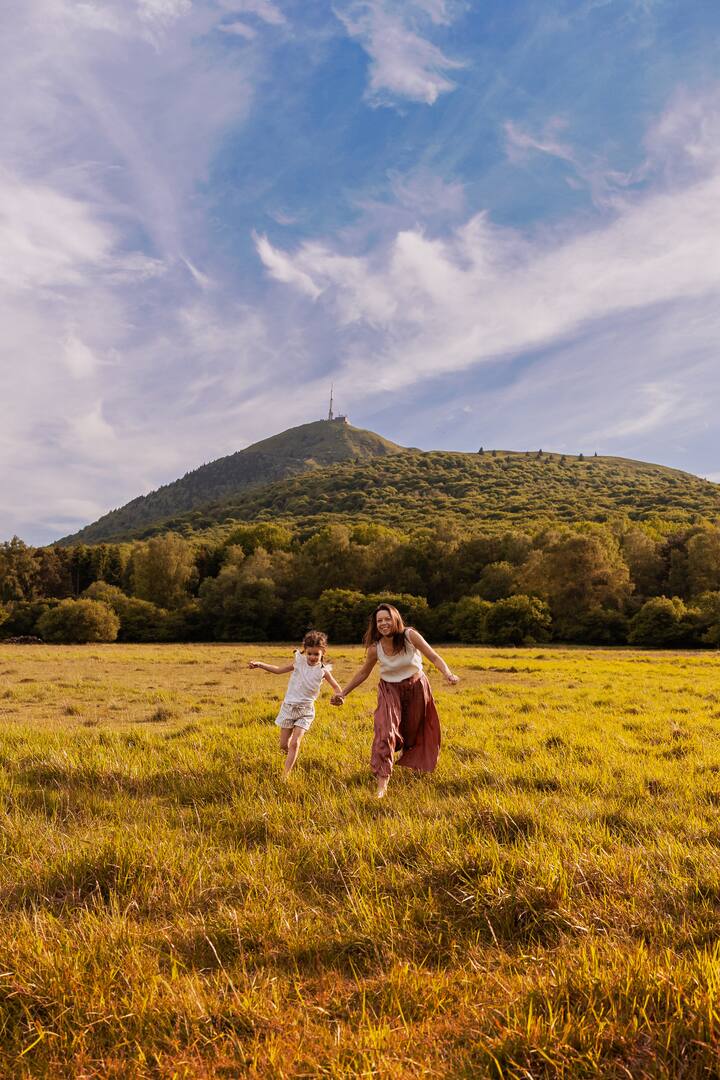 Sessjoni ta' teħid ta' ritratti professjonali tal-familja jew koppja fi spazju naturali madwar Clermont-Ferrand, b' Chaîne des Puys fuq quddiem nett.