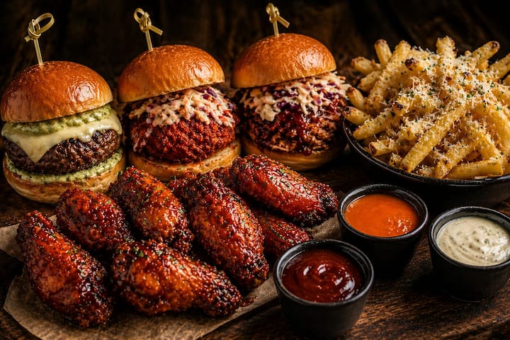 Il-Menu jinkludi: • Sliders taċ-ċanga Brażiljana bil-Green Mayonnaise magħmula mid-dar u ġobon imdewweb • Għażla ta' sliders Nashville Hot Chicken jew Pulled Pork bil-Coleslaw • Ġwienaħ tat-Tiġieġ Crispy biz-Zalza BBQ, Buffalo, jew Garlic Parmesan Sauce • Fries (klassiċi jew bit-tartuf)