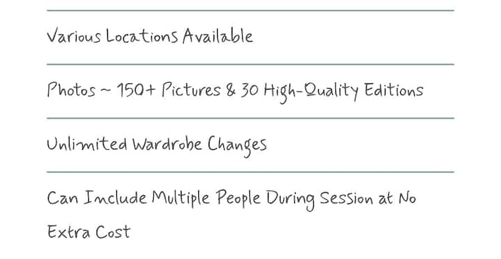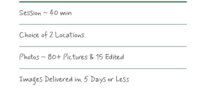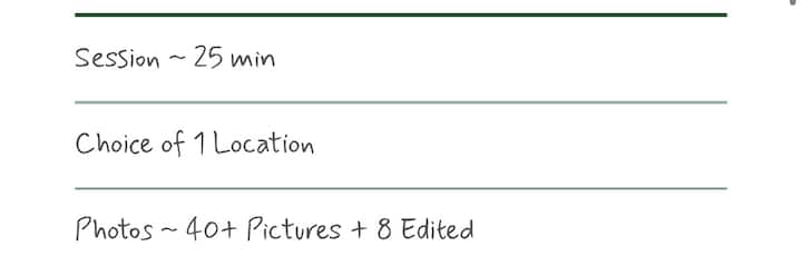 Dan il-pakkett jinkludi sessjoni ta' ritratti tal-familja jew tal-avvenimenti sa 60 minuta, prezzijiet speċjali u gallerija personali.