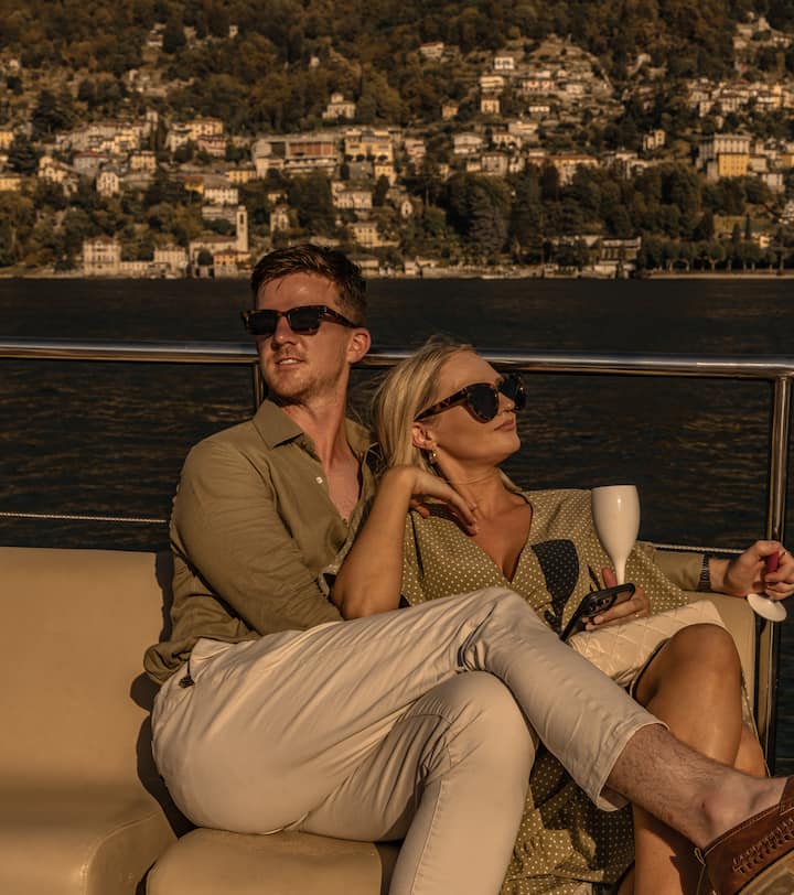 Gawdi sessjoni ta' teħid ta' ritratti professjonali itwal fl-isfond tad-deheb tal-Lag Como.