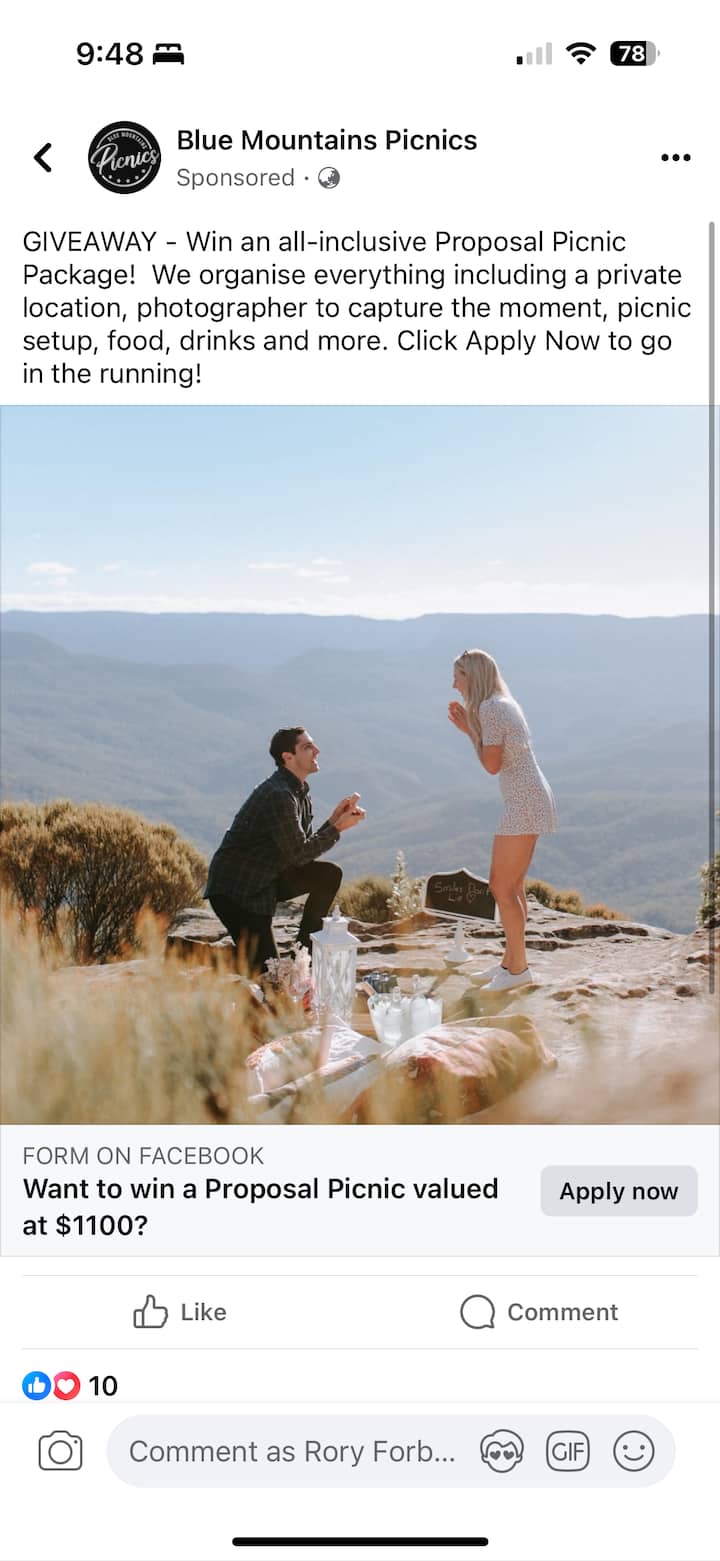 Pakkett biex tħejji u tieħu ritratti ta' proposti għaż-żwieġ. Jinkludi piknik jew xampanja għal mument mill-isbaħ.