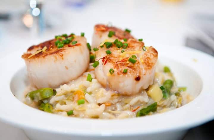 Gawdi minn menu raffinat ta' scallop carpaccio b' bżar roża, cappuccino b' papra foie gras, vital involtini b' asparagu aħdar u macaron tal-lampun tal-vanilla.