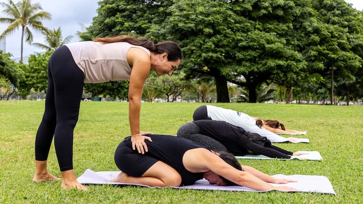 Għalliem tal-yoga privat għal familja magħrufa f'Honolulu, Hawaii.