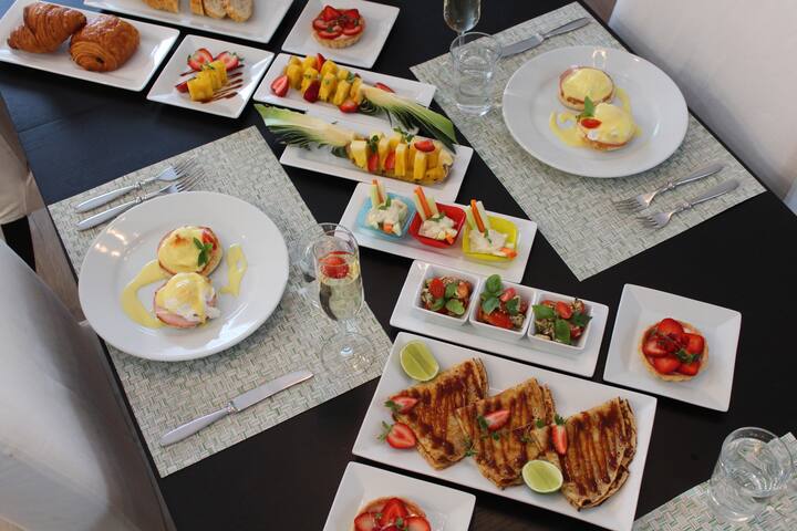 Din l-għażla ta' oġġetti ta' brunch-breakfast għaġina, bajd maħmuġ tas-salamun affumikat, frott frisk imqatta', parfait tal-frawli, u insalata tal-kale b' jalapeño dressing- hija ssettjata minn qabel fuq il-mejda, segwita minn kors ewlieni tal-għażla tiegħek imsajjar frisk biex jiġi ordnat fil-kċina.