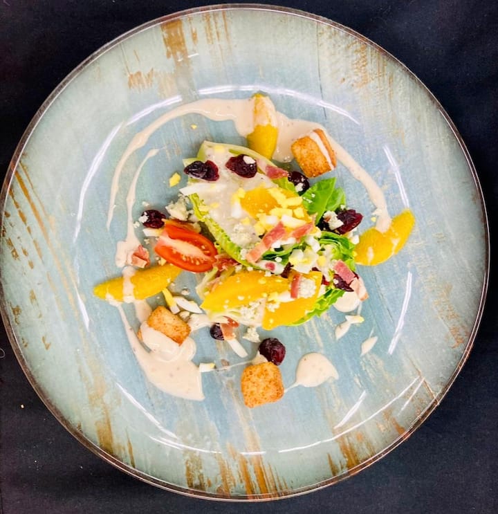 Ibda b' dawra kuraġġuża fuq l-insalata ta' Caesar li fiha ħass tal-ġemel, ġobon ikħal, cranberries, bajd, bacon u dressing ta' Cesar oranġjo. Segwi b' filet taċ-ċanga maqtugħ perfettament, lest b' demi glace rikka ta' blackberry. Temm fuq nota mdawla b' tart tal-lumi mgħottija bil-berries infużi tal-Grand Marnier.