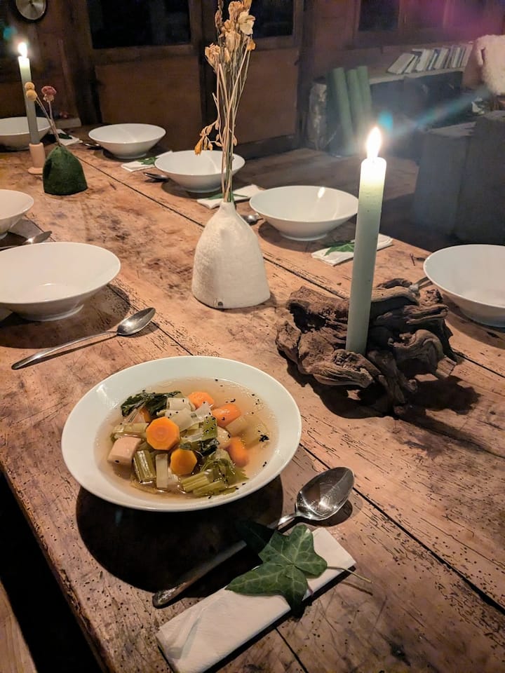 Għal dan il-menu li jħaddan is-sinjal tas-sejħa tal-foresta, ridt li l-kċina tkun kontinwità tal-esperjenza li għaddiet minnha. Ħloqt dekorazzjoni tal-mejda ispirata minn din in-natura biex inkompli nimmersjona. Ġbart il-faqqiegħ fil-boskijiet, fejn jiltaqgħu l-Lozère, il-Gard u s-Cévennes. Ġbart il-qastan fil-foresta ta' Fontainebleau.