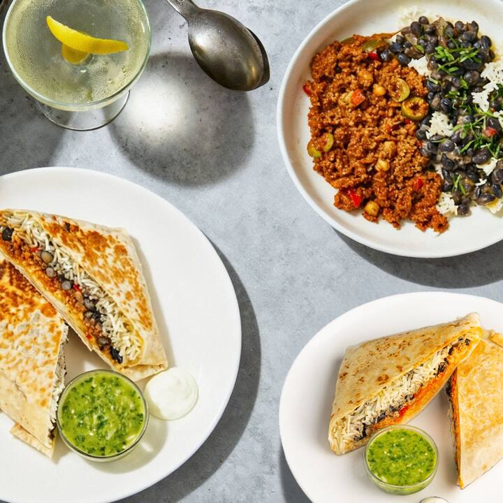 3 ikliet. Ix-Chef Jose Garces iġib togħma kbira, tliet modi—jinkludu Mission-Style Chicken Burrito (tiġieġ imsajjar bil-mod biċ-chipotle bir-ross, fażola sewda, u ġobon, servut bil-crema u s-salsa verde), Mission-Style Beef Burrito (ċanga msajra bil-mod bir-ross, fażola sewda, u ġobon, flimkien mal-crema u s-salsa verde), u Cuban-Style Beef Picadillo (ċanga msajra bil-mod biż-żbib, żebbuġ, kappari, servut fuq ross u fażola sewda bil-kosbor frisk u l-ġir).Jinkludi kampjun ta' kull ikla.