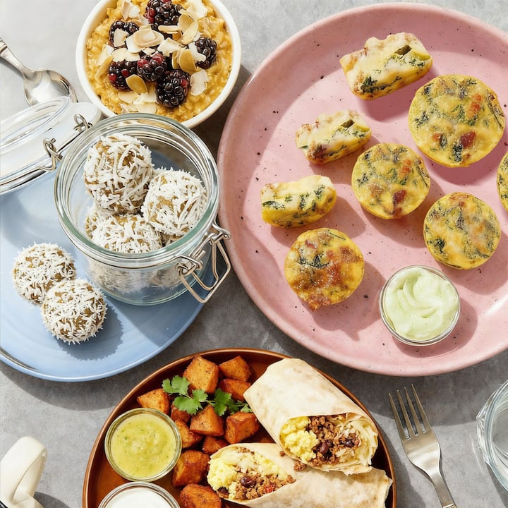 6 oġġetti. Gawdi firxa ta’ platti mill-Kok Jose Garces li jġiegħlek tħossok aħjar—li tinkludi Bacon & Mozzarella Egg Bites (servuti biz-zalza green goddess), Chorizo & Egg Burrito (chorizo Messikan, bajd scrambled, queso, u patata, servut bil-crema u s-salsa verde), Mango-Coconut Overnight Oats (biż-żrieragħ rossi, coconut mixwi, u lewż), u Coconut-Matcha Energy Balls (magħmulin bil-ġewż tal-Indi, agave, u tamal).Jinkludi ordni waħda ta' Egg Bites, Burrito wieħed, 2 Oats, 2 ordnijiet ta' Energy Balls.