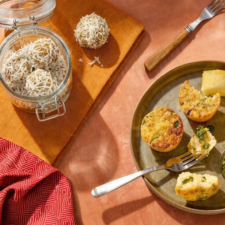 4 oġġetti. Snacks bla tbatija u b'togħma qawwija mix-Chef Jose Garces għal kwalunkwe ħin tal-ġurnata—li jinkludu Bacon & Mozzarella Egg Bites (bejken, mozzarella, u spinaċi, servuti biz-zalza green goddess dipping) u Coconut-Matcha Energy Balls (snacks ħelwin naturalment li fihom ukoll anakardju, agave, u tamal).Jinkludi 2 ordnijiet ta' Egg Bites, 2 ordnijiet ta' Energy Balls.