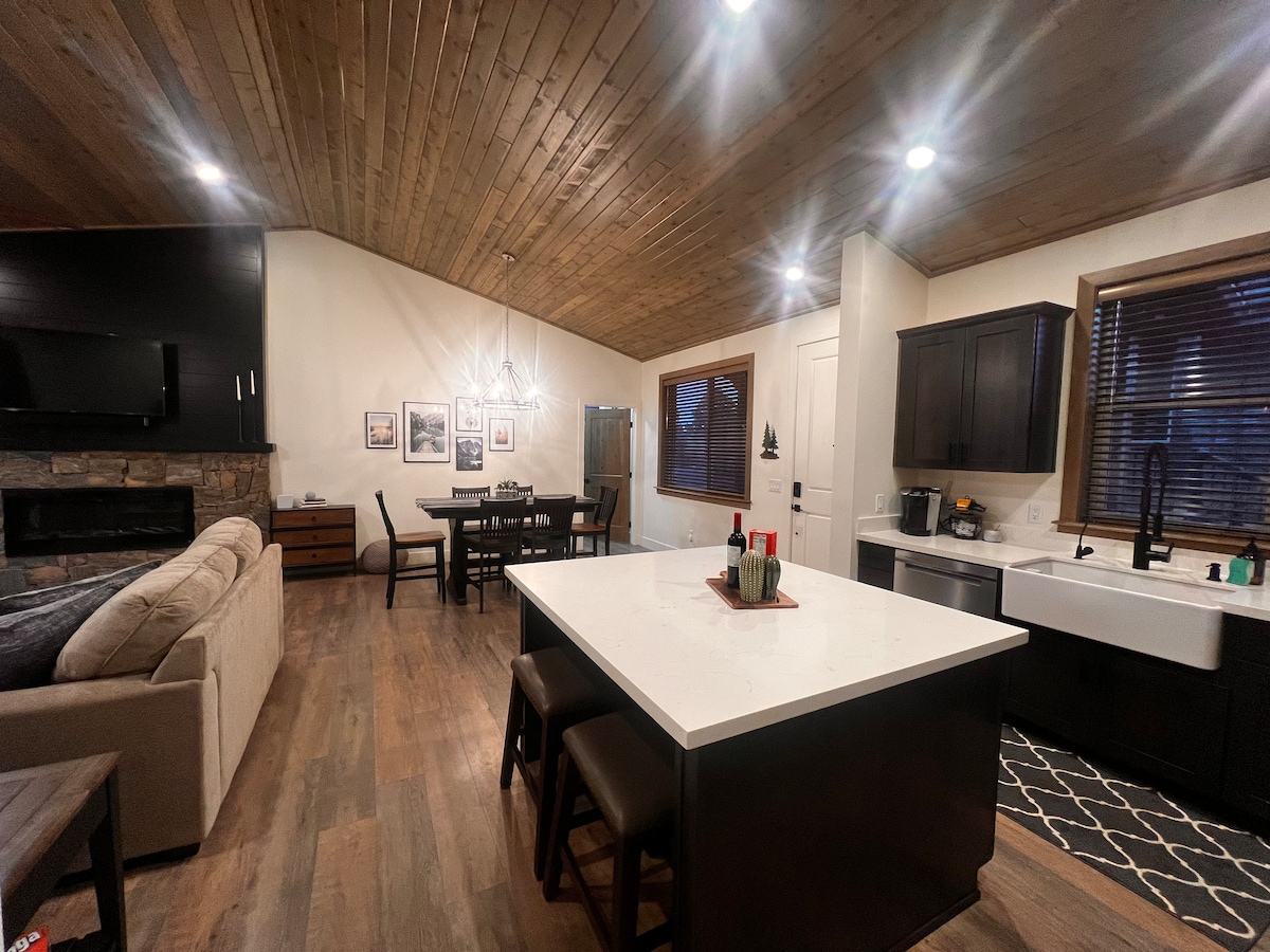 MERĦBA fil-vaganza komda tiegħek. Din hija l-vaganza PERFETTA! 2 BD/ 2 BA eleganti li għandha wkoll fireplace fuq ġewwa, 2 garaxxijiet tal-karozzi u terrazzin ta' quddiem u ta' wara! Bini ġdid fjamant, mibni fl-2022! Inkluż ukoll: * 2 Garaxx tal-Karozzi * Il-pjan tas-Sular Maqsum jippermetti l-privatezza * Postijiet komdi fejn toqgħod bilqiegħda biex tlaqqa' miegħek għat-taħdit, għat-TV u għal-logħob * Gawdi t-terrazzin mgħotti b' veduti tal-foresta nazzjonali Hija l-aħjar ħarba għal kulħadd jew iġġib il-familja kollha magħha.