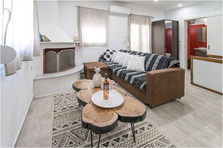 Merħba fil-gżira kosmopolitana ta' Skiathos! Id-dar Bohemian Townhouse "Sular ta' fuq", hija appartament irranġat dan l-aħħar u tinsab qrib il-knisja ċentrali, ħdejn taverna tradizzjonali b' mużika live. Hija biss 4 minuti mixi 'l bogħod miż-żona tal-port u 7 minuti' l bogħod mill-parkeġġ pubbliku ta' Acropolis. Is-sular ta' fuq jista' jilqa' sa 4 persuni. Għandha sodda doppja u sufan-sodda u kċina mgħammra b' kollox. Hemm gallarija żgħira b' siġġijiet u mejda wkoll.